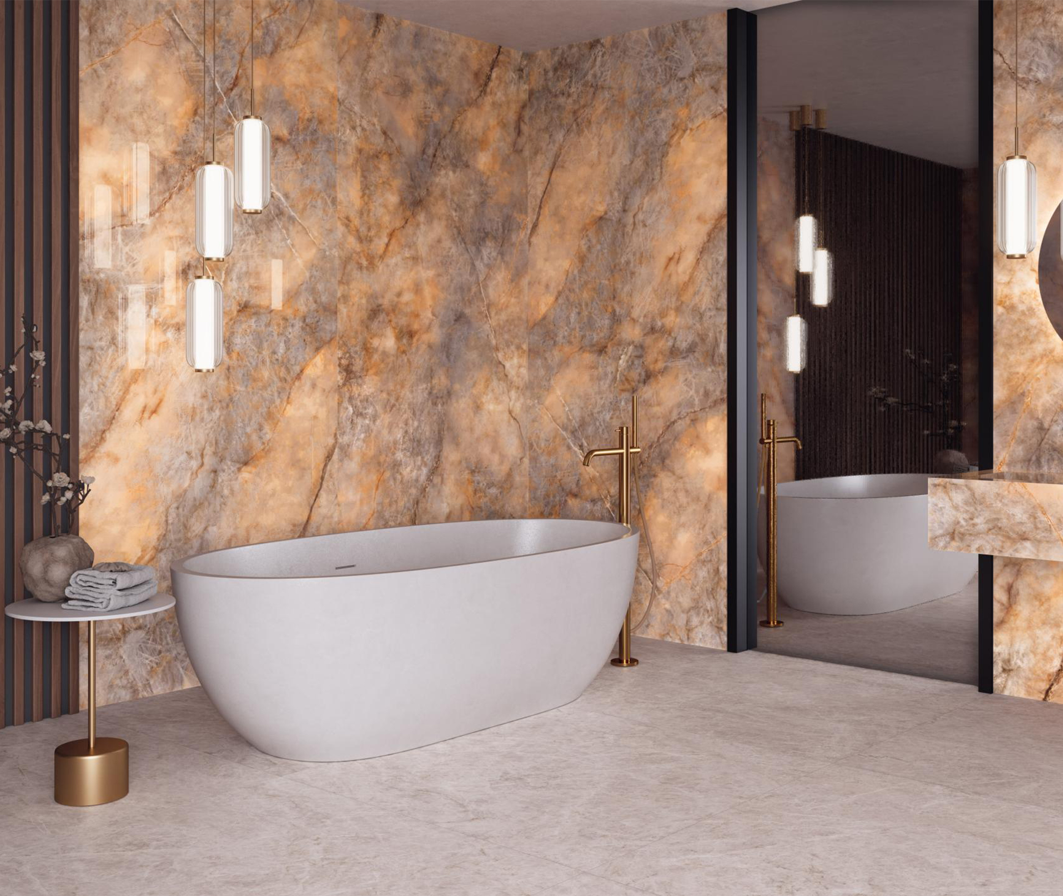 Плитка с полированной поверхностью смотрится особенно реалистично с природными текстурами (так, часто сложно отличить полированную плитку с текстурой камня от натурального материала).